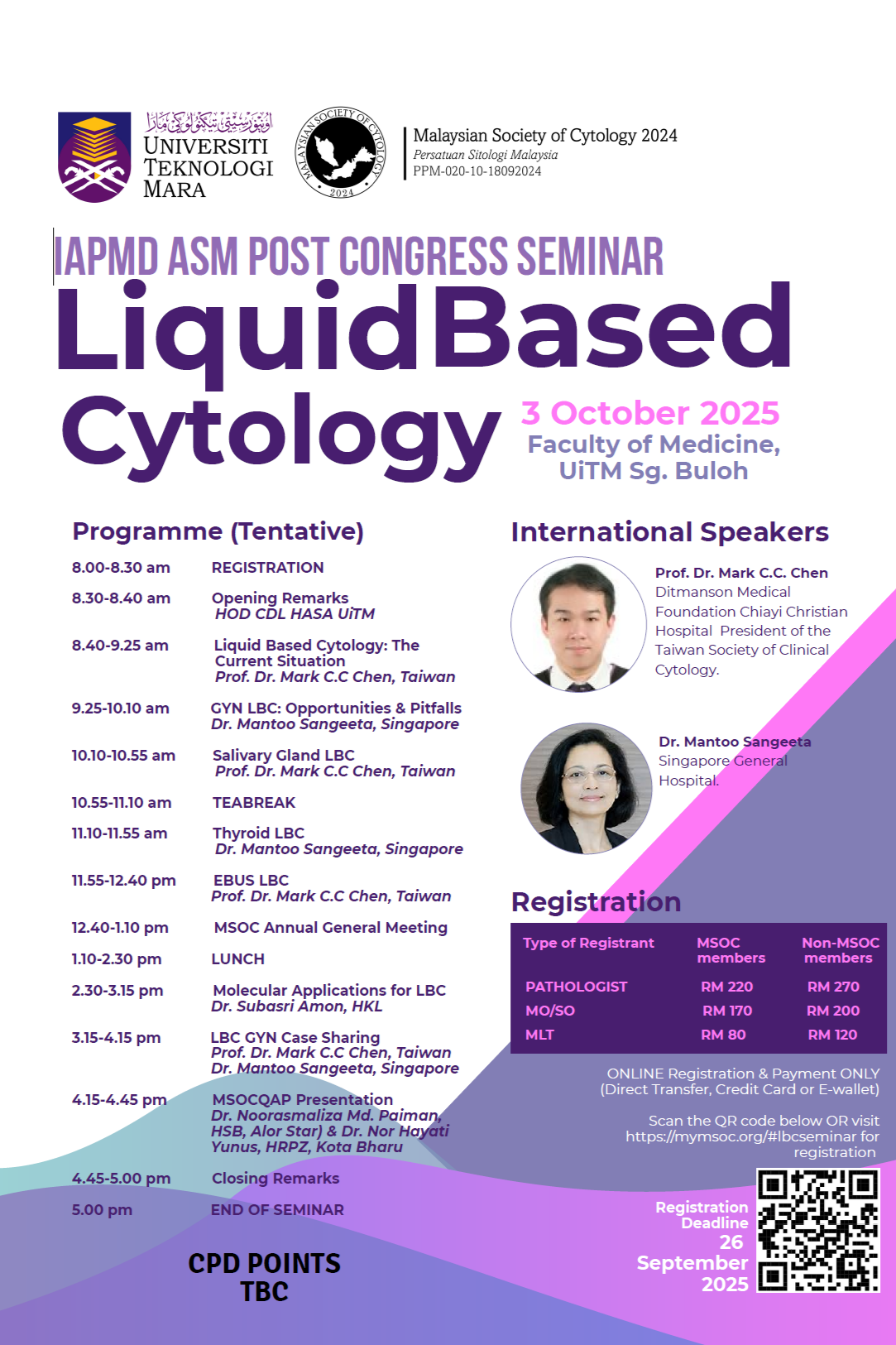 The Clinical Diagnostic Laboratory, Hospital Al-Sultan Abdullah, UiTM, in collaboration with the Malaysian Society of Cytology (MSOC), is pleased to invite you to the IAPMD Annual Scientific Meeting Post Congress Seminar.